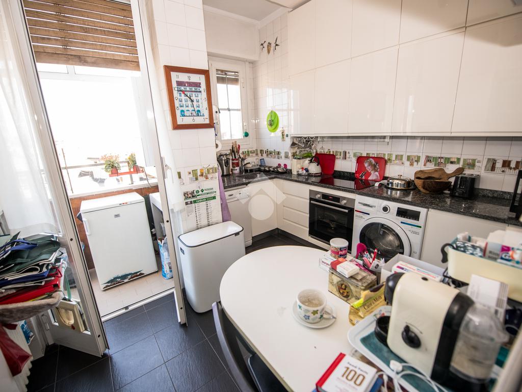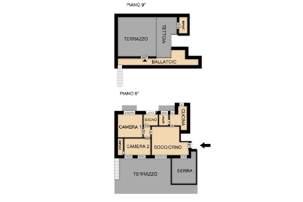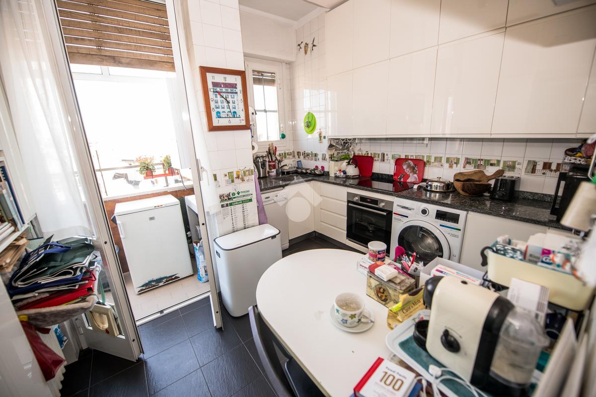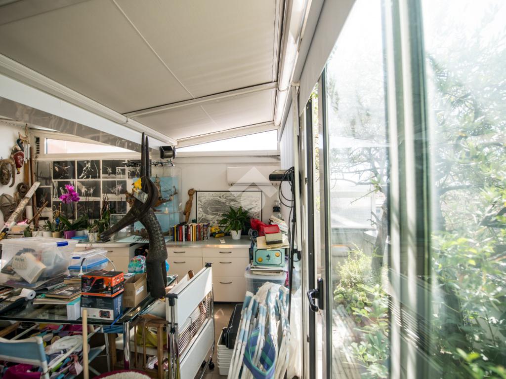L'appartamento si compone di un ampio soggiorno con accesso diretto al terrazzo principale e alla serra, perfetta come angolo relax o giardino d'inverno, una cucina separata, due camere da letto e doppi servizi.