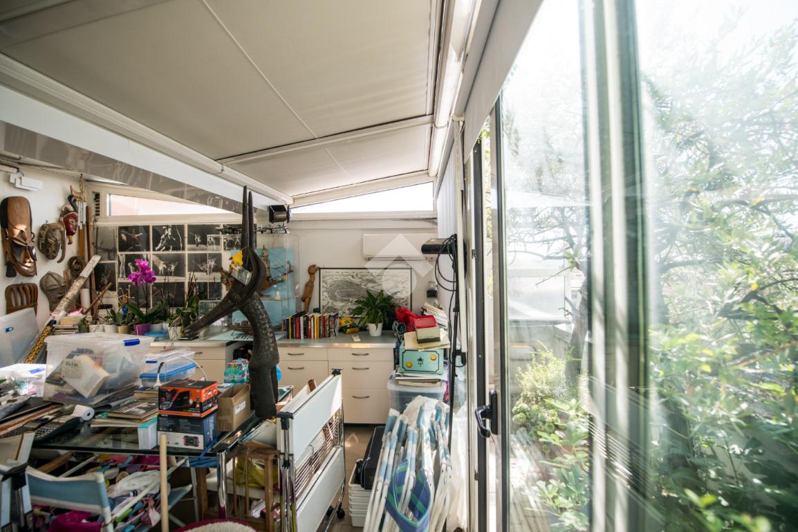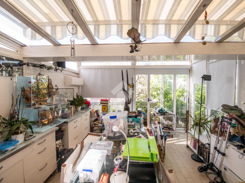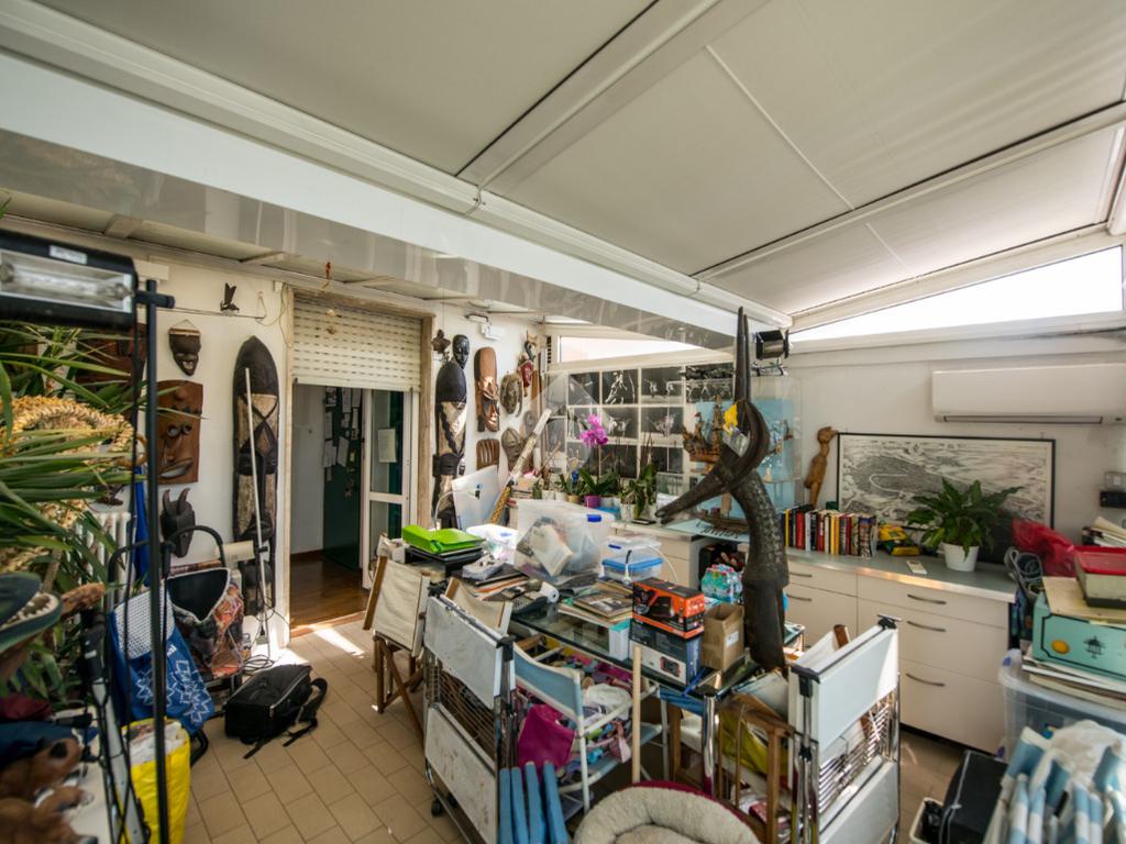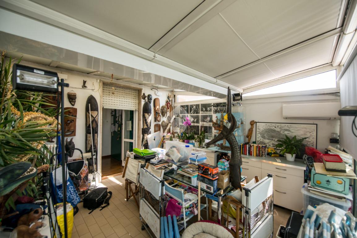 Una scala esterna, in acciaio inossidabile così come le ringhiere, conduce al secondo terrazzo soprastante, un'oasi esclusiva con una vista mozzafiato a 360 gradi sulla città. Qui si trova anche una tettoia attualmente chiusa, adibita a studiolo, ideale come spazio creativo.